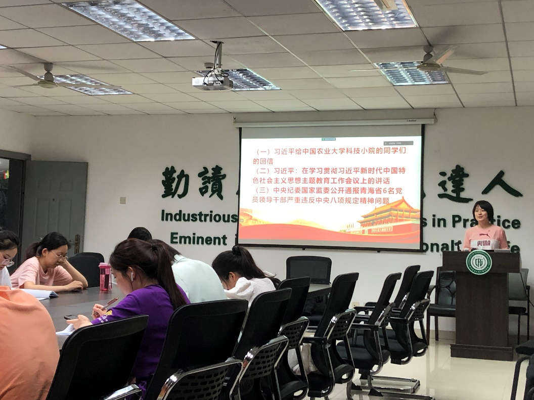 会议伊始,卞采笑同志向参会党员介绍了本次主题党日的活动内容,主要包括对近期习近平总书记讲话精神文件和监委调查通报事件的学习,一是习近平给中国农业大学科技小院的同学们的回信,二是习近平在学习贯彻习近平新时代中国特色社会主义思想主题教育工作会议上的讲话,三是中央纪委国家监委公开通报青海省6名党员领导干部严重违反中央八项规定精神问题事件。