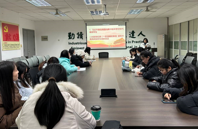 首先,李芝同志带领党员同志们学习了习近平复信美国马斯卡廷中学访华代表团学生的内容。信中习近平主席对代表团致以节日祝福,并强调中国是一个开放的国家,欢迎各国青少年朋友来华交流学习,亲身感受一个真实、立体、全面的中国,携手增进各国人民之间的友谊。李芝同志也结合自身汉语教学经历,明确要用自身专业知识,传播好中国文化,吸引更多外国友人来华交流。