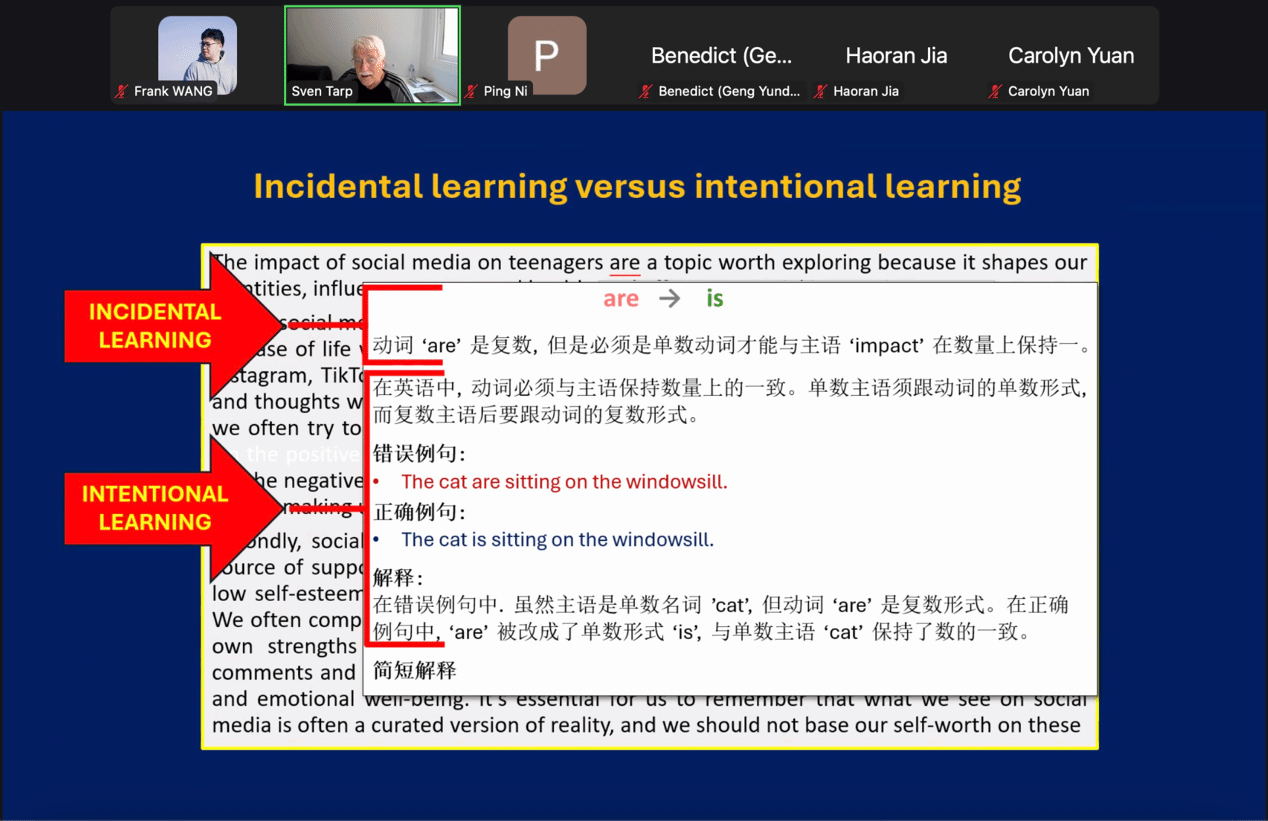 同时,塔普教授以自身西班牙语学习为例,说明通过大量沉浸式的附带学习,他在短时间内实现了语言能力的快速提升。他强调,未来AI赋能的词典研发应服务于不打断专注的学习体验,这样既能促进附带学习,也可以针对性满足有意学习的深入需求。