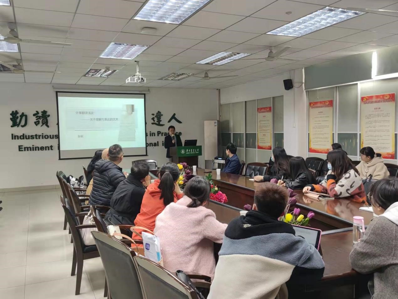 (通讯员 李宇佳)11月30日下午,湖北省委外办外事翻译中心英语翻译张银应邀做客第155期外语论坛·专家论道,为pg娱乐官网师生作了题为“外事翻译浅谈——关于理解与表达的艺术”的专题讲座。学院教师、研究生、本科生,及武汉华夏理工学院国际学院院长肖凤华、华农外院校友武汉外语外事职业学院教师庄静等现场聆听讲座。学院副院长覃江华代表学院致欢迎辞并主持讲座。