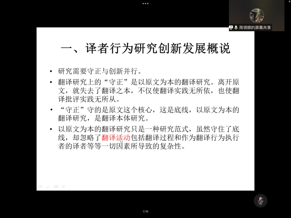 周领顺在总结中谈到,在新的转型期,创新发展译者行为研究不仅能为,而且可为,它有可持续的基础和路径、可持续挖掘的课题和领域等,处处充满了创新发展的条件和广阔前景。讲座末尾的互动环节,与会师生踊跃提问,周教授与大家展开了热烈讨论,他逐一耐心解答了听众提出的问题。师生们旺盛的求知欲使腾讯会议室里热闹的氛围久久不能平息。