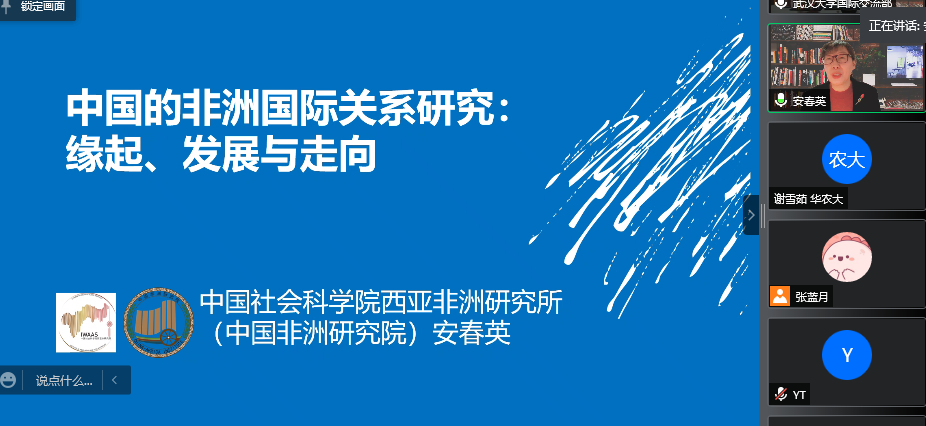 12月23日下午,中国社会科学院西亚非洲研究所(中国非洲研究院)《西亚非洲》常务副主编、编审安春英老师做客pg娱乐官网163期外语论坛·专家讲道,通过腾讯会议平台做了题为“中国的非洲国际关系研究:缘起、发展和走向”的讲座。本次讲座由pg娱乐官网国别与区域暨世界农业文化研究中心和武汉大学非洲研究中心联合举办,王战教授主持。