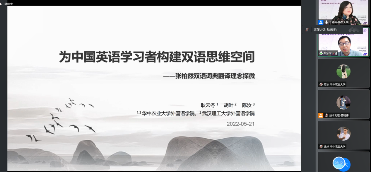 大会设6场主旨报告和4组分论坛报告,耿云冬与来自鲁东大学的于德英教授共同主持分论坛一“中国特色译学建设与理论创新”,该论坛通过哔哩哔哩网站全网直播。耿云冬做了题为“为中国英语学习者构建双语思维空间——张柏然双语词典翻译理念探微”的发言(合作者:胡叶、陈汝)。该研究首先追思张柏然先生的辞书人生,然后从“语境论”视角出发,立足对个案词条different的微观考察,尝试将张柏然先生的双语词典翻译理念归纳为三个方面:“词目对译:去语境化维度的跨语析译”、“例句译释:再语境化维度的动态等效”和“同义辨析:微语境化维度的对比诠解”,意在揭示张柏然先生通过双语词典文本帮助中国英语学习者拓展双语思维的独特运思。