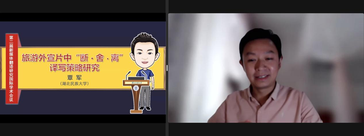 湖北民族大学覃军副教授围绕“旅游宣传片外宣中的‘断舍离’译写策略”进行分享,从英汉旅游用语的特点出发,结合字幕翻译中瞬间性和通识性的要求,以及中译影片的四大“害处”(因词害意、爱用典故、诗词楹联、缺少信息)探讨字幕翻译中实施“断舍离”译写策略的必要性。