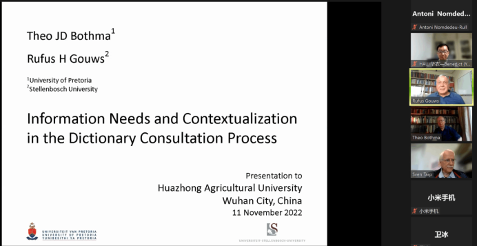 2022年11月11日晚,南非比勒陀利亚大学Theo J. D. Bothma教授与南非斯泰伦博斯大学Rufus H. Gouws教授应邀做客第192期外语论坛·专家论道,以“Information Needs and Contextualization in the Dictionary Consultation Process”(信息需求与词典查询过程中的语境化)为题,联袂为pg娱乐官网师生做了精彩的线上讲座。讲座由pg娱乐官网语言学跨学科研究中心主办,国际知名词典学家、丹麦奥胡斯大学Sven Tarp教授受邀担纲本场讲座主持人。