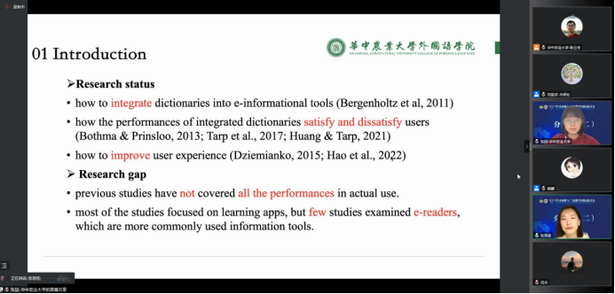 pg娱乐官网学术型硕士张喆和张思佳合作做了题为“Reflections on the Improvement of Integrated Dictionaries in PDF-Reader”的发言。该研究以苹果公司的电子阅读应用“PDF-Reader”为研究对象,首先界定了“内置词典”(integrated dictionary)这一新形态数字词典概念;然后,从用户视角剖析了PDF-Reader内置词典(integrated dictionary)的优缺点;最后,针对数字阅读器中的内置词典(integrated dictionary)不足之处,提出优化建议,期冀为提升用户的数字阅读体验提供更好的辞书知识服务。