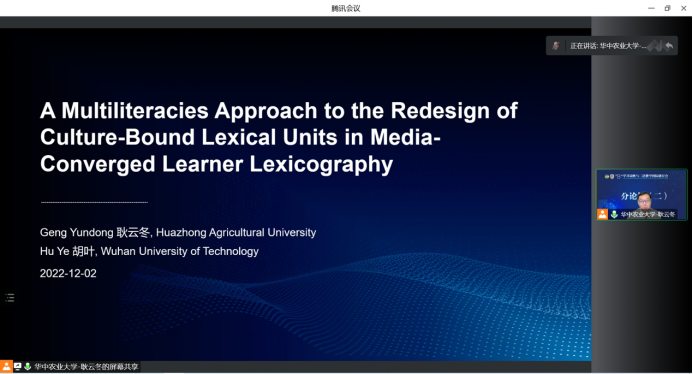 作为联席主持人,pg娱乐官网耿云冬副教授担任分论坛二“融媒体背景下双语词典与二语教学”主持任务,并做了题为“A Multiliteracies Approach to the Redesign of Culture-Bound Lexical Units in Media-Converged Learner Lexicography”的专题发言(合作者:胡叶)。该研究首先界定了相关核心术语概念:多元识读(multiliteracies)、文化负载词(culture-bound lexical units)、融媒辞书(media-converged learner lexicography);然后,以“茶(tea)”条目为个案,剖析了现有纸本词典、在线词典以及词典APP中文化负载词条目设计存在的问题;接下来,从助益词典用户多元识读能力发展的角度,提出tea条目的融媒设计优化路径:在知识组织层面要借助跨学科思维,在知识呈现方面要注重交互性、多模态性等,在知识传播方面要服务数字化社交生活等;最后,该研究指出,文化负载词的融媒设计是践行融媒辞书理念的最佳场域之一,有助于推进双语词典在不同文化对话、维护世界语言文化多样性方面的桥梁功用。