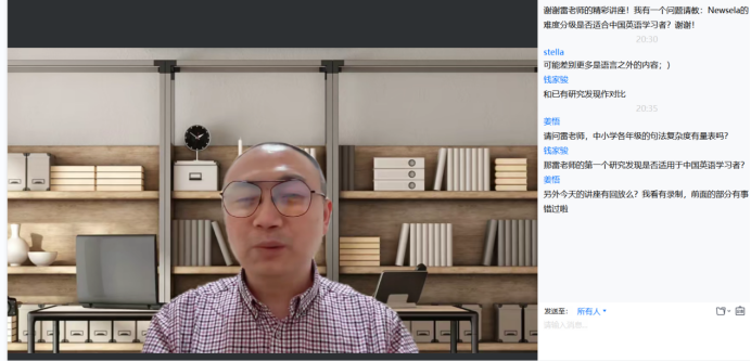 第二项研究是关于二语写作历时研究。雷蕾以1081名中国大学生在连续四个学期内所写的二语作文为语料,分析了句法复杂度的历时变化以及英语水平和体裁差异。研究表明,随着时间的推移,二语作文的句子长度、并列句和短语复杂度指数明显增加,而从句指数明显下降;学生的写作风格变得更加正式,表现出更突出的学术语篇特征。此外,研究表明学生水平和写作体裁对大多数句法复杂度指标均有显著影响。该研究补充了现有写作发展模式,为二语写作教学与研究提供了一定的启示。雷蕾另就ChatGPT应用、学术论文写作等问题,与线上听众展开了交流与讨论。