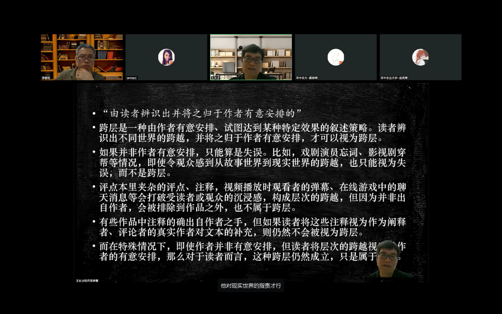 讲座结束后,众多师生纷纷就讲座内容积极提问,王成才与师生就“作家在写作的时候运用跨层这一叙述手法是想达到何种效果?”“插入情节是否突兀是不是可以被视为区分跨层和穿插式的一个标准?”等问题展开了热烈讨论。李敏锐对讲座进行总结和点评,并对王成才的线上讲座和分享表示衷心感谢。