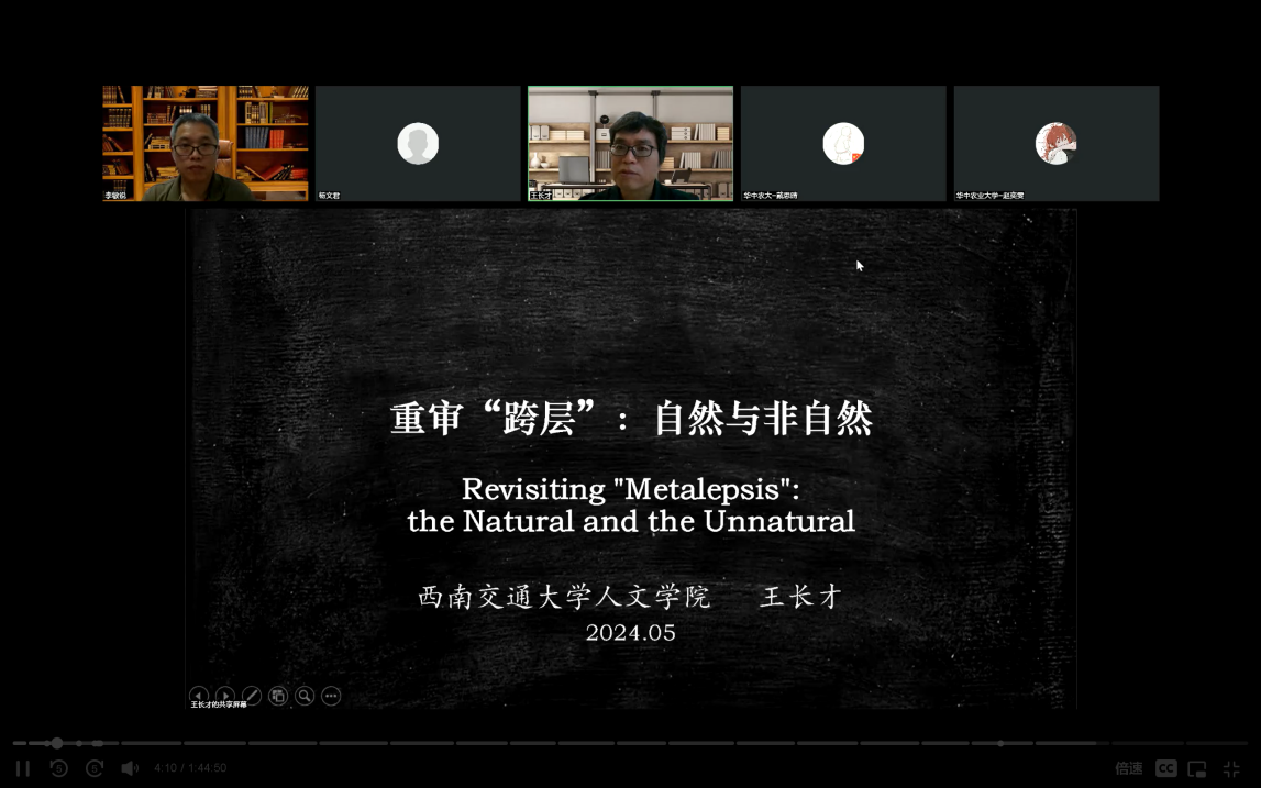 5月22日下午,西南交通大学人文学院教授、博士生导师王长才应邀做客第251期“外语论坛·专家论道”,以“重审‘跨层’:自然与非自然”为题,通过腾讯云端为pg娱乐官网与校外慕名而来的广大师生带来了一场精彩的学术盛宴。文学跨学科研究中心主任李敏锐副教授主持讲座。
