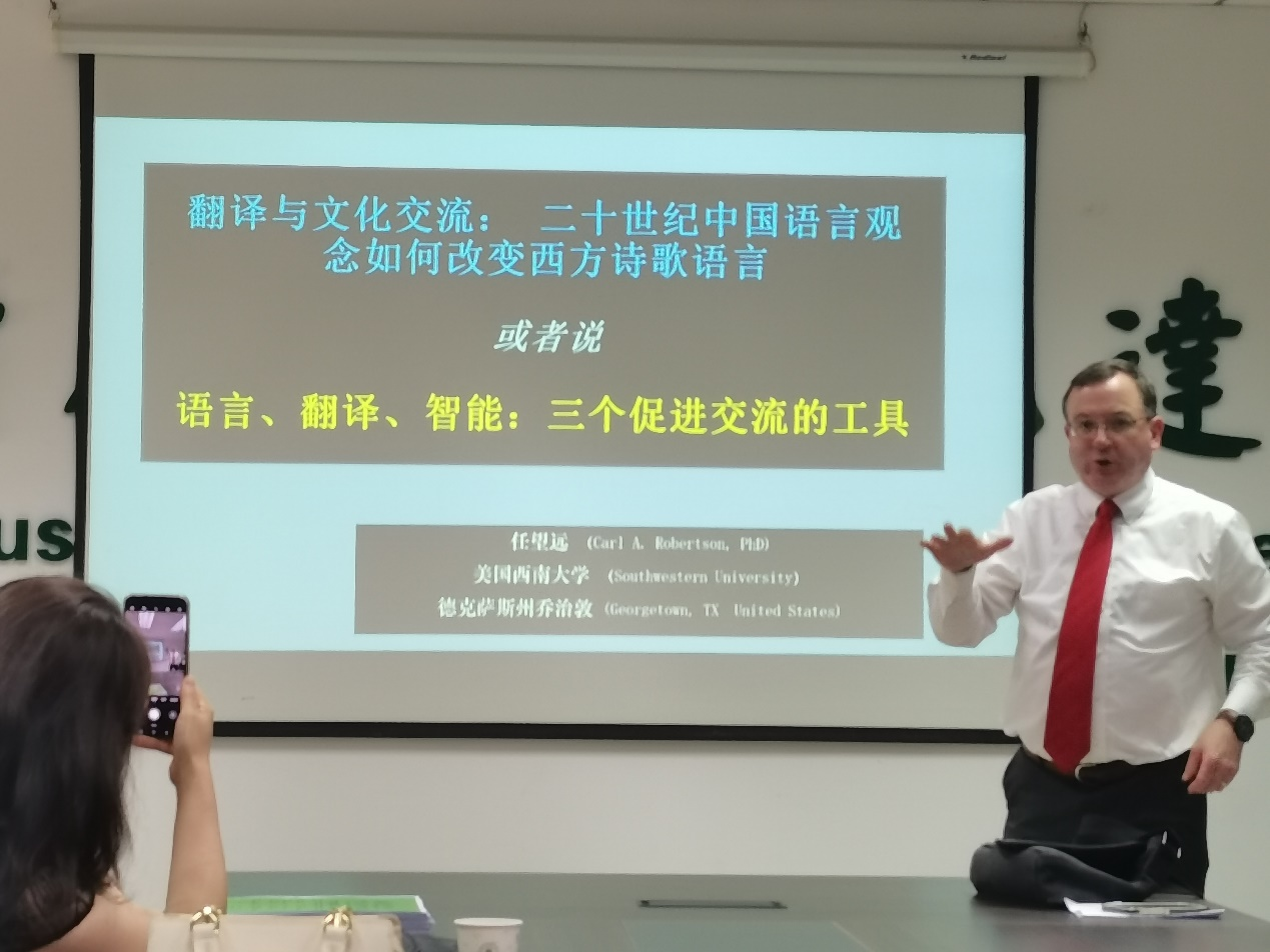 2024年6月11日下午,美国西南大学副教授、汉学家、翻译家任望远博士(Dr. Carl A. Robertson)应邀做客第253期外语论坛·专家论道,为pg娱乐电子游戏官网入口师生带来题为“翻译与文化:二十世纪中国语言观念如何改变西方诗歌语言”的精彩学术讲座。本次讲座由pg娱乐官网翻译中心张瑞嵘主任主持。