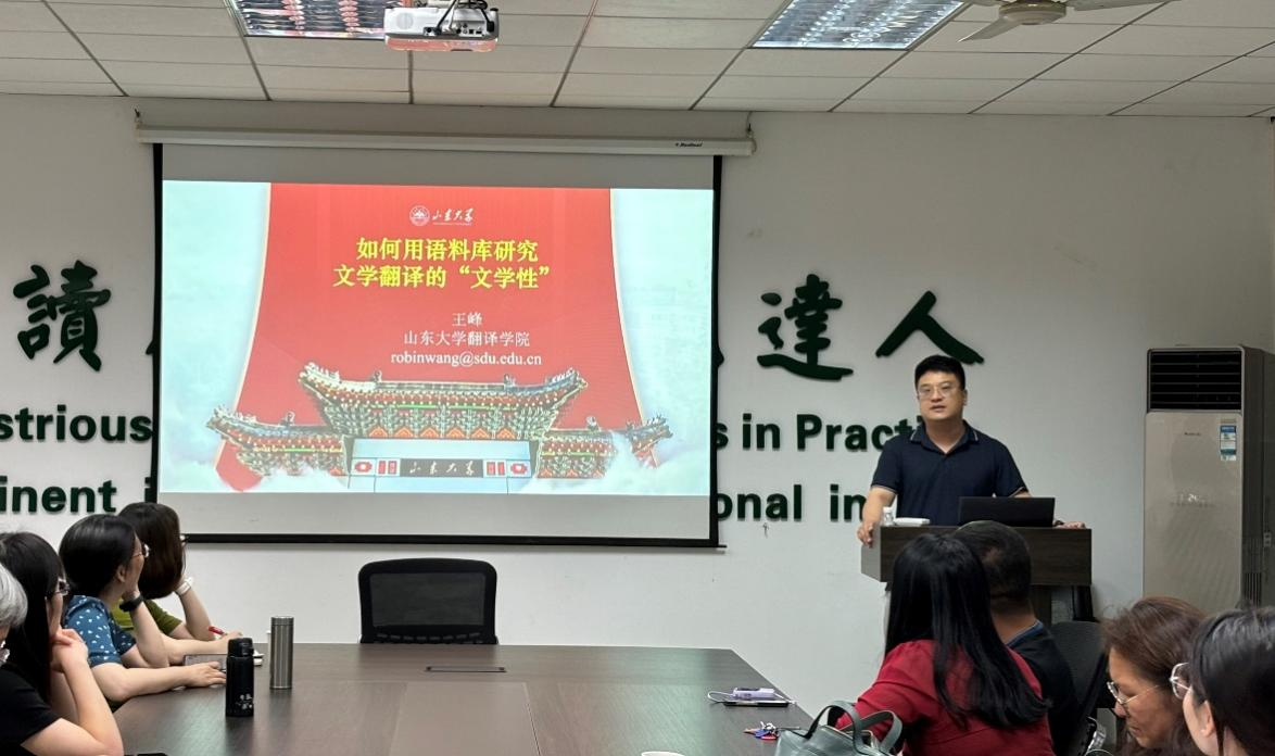 6月25日下午,山东大学翻译学院教授、博士生导师王峰应邀做客第254期“外语论坛·专家论道”,以“如何结合语料库研究文学翻译的‘文学性’”为题,为pg娱乐电子游戏官网入口师生带来了一场学术盛宴。本次讲座由pg娱乐官网贺赛波副教授主持。王峰首先以泰戈尔—冰心的比较文学影响研究为案例,分析了冰心从翻译泰戈尔散文诗《吉檀迦利》《园丁集》到创造小诗《繁星》《春水》的诗学借鉴与创新。通过语料库的共同主题词、平均句长的方法对比了两种诗歌体裁的形式特征,结合概念隐喻、社会文化语境展示了冰心的诗学创新。