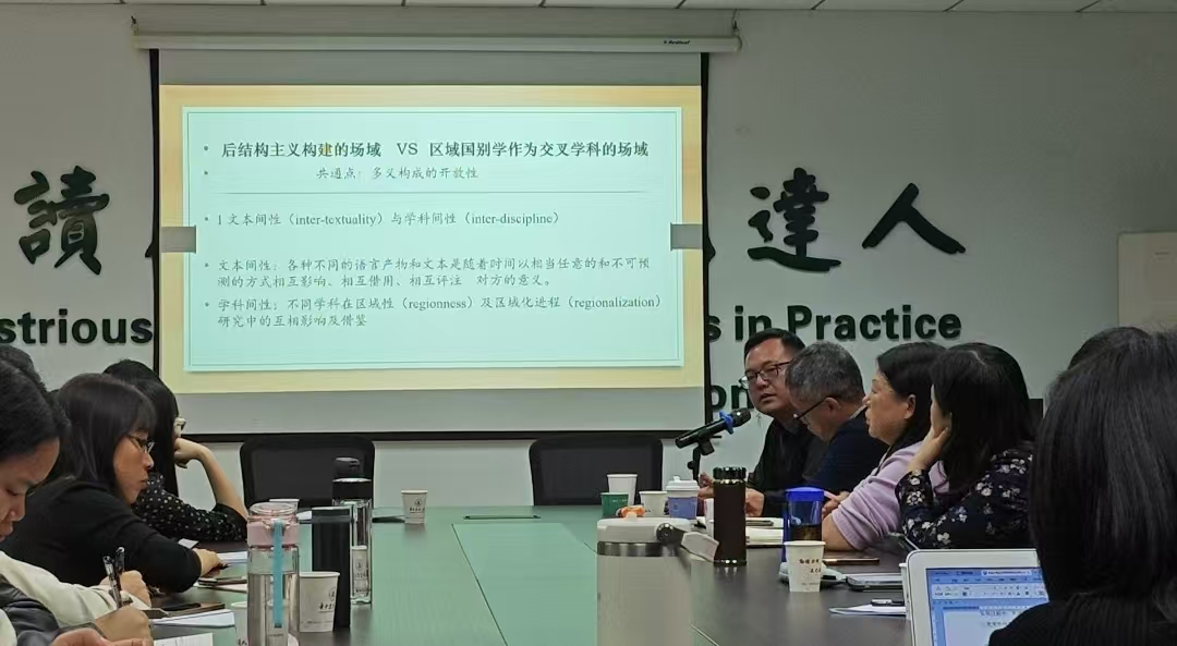 陈靓教授开宗明义,首先介绍了区域国别学的定义、重要性以及当前所面临的挑战。讨论了国别和区域研究如何借助历史学、哲学等学科理论和方法,探讨对象国家和区域的历史文化、政治经济社会制度及中外关系;并指出跨学科意识不强、视野不开阔以及涉区域国别的问题意识不够等是当前区域国别研究面临的主要挑战。针对这些问题与挑战,陈靓教授又分别分析了不同学科,如经济学、法学、历史学和文学在区域国别研究中的作用和贡献;并勉励外语学科学者,强调了外语学科在提供基础人才、增强语言和文化素养、提升跨文化实践能力以及构建学科自主知识方面的五大作用,勉励外语学科学者要走出舒适区,转换学术思维。陈靓教授特别强调了后结构主义视域下外语学科的交叉性建设,探讨了后结构主义理论源起及其对区域国别学的影响,包括文本间性与学科间性的概念,以及后结构主义的视角说与交叉学科的视域说;讨论了后结构主义如何将阅读转变为一种社会实践,以及区域国别学如何促进相关学科的应用性研究领域开拓。陈靓教授还指出了外语学科向区域国别方向可拓展的研究方向,包括人文知识体系建设、文化特质研究等;并介绍了新文科的研究理念,强调实践性和应用性价值导向。陈靓教授从宏观角度探讨了语言政策规划与区域国别学的关系,如话语政策、话语治理等方面,再次强调了区域国别研究对国家的重要意义;又从语言学、翻译学等具体学科领域出发,勉励外语学科学者在研究时一定要坚定中国意识、中国立场,并注重与外国文化的互动性,如中外文学中的民族性比较,以提升宣传效果。