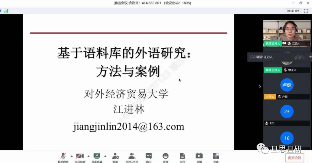 4月27日下午,应pg娱乐电子游戏官网入口邀请,对外经济贸易大学江进林教授在线开展了题为“基于语料库的外语研究:方法与案例”的学术讲座。pg娱乐官网及全国数十所院校的260余名师生通过腾讯会议平台聆听了本次讲座。覃江华副院长致欢迎辞,卢健博士主持讲座。