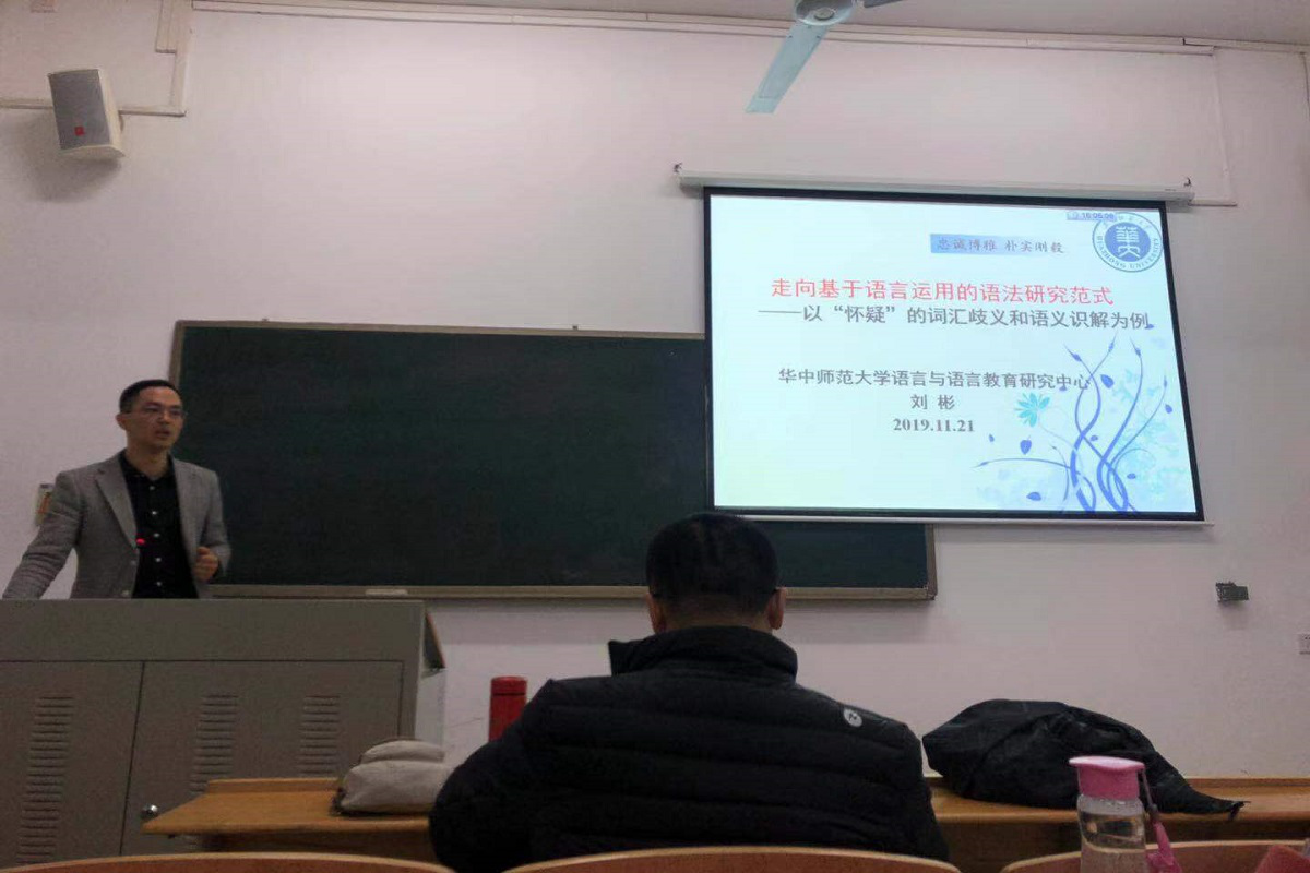 11月21日下午4点,华中师范大学语言与语言教育研究中心刘彬讲师坐客pg娱乐官网,在一教105室为pg娱乐电子游戏官网入口师生开展了“走向基于语言运用的语法研究范式--以“怀疑”的词汇歧义和语义识解为例”主题讲座。