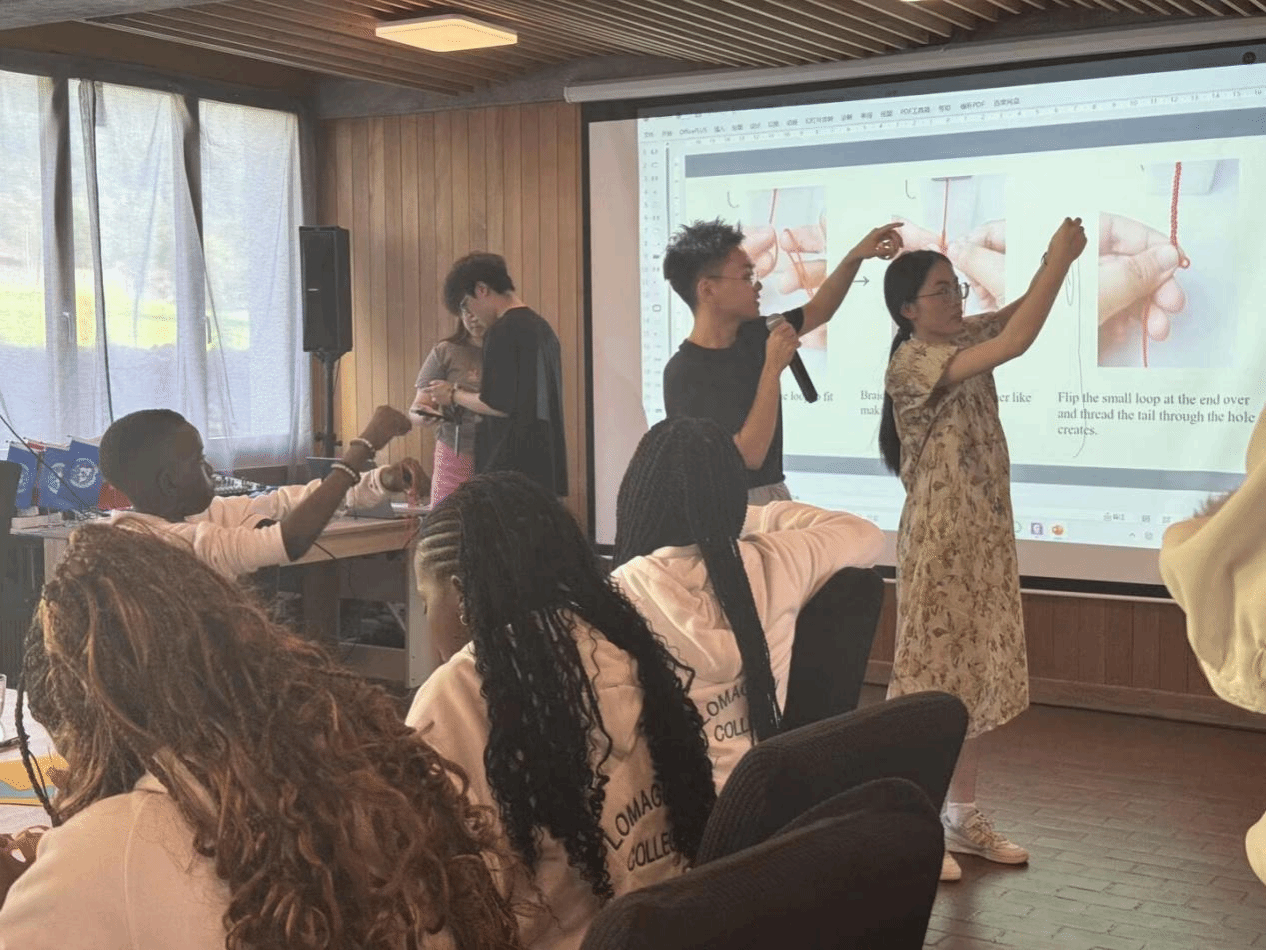 折纸活动结束后,畲族彩带编织活动紧随其后。队员们先讲述了这项非遗的渊源:畲族彩带是畲族妇女代代相传的手工艺,距今已有千年历史。活动进行过程中,实践团依据现场制作进度适当降低了编织难度,选择了更好上手的“麻花辫”编法,尽可能做到让每一位参与者都能收获亲手完成编织的成就感。彩带有蓝、绿、红三色,谈及颜色的选择,实践队成员说:“蓝色像日内瓦湖的粼粼波光,也是中国青花瓷的淡雅底色;绿色是阿尔卑斯山的盎然生机,也藏在江南园林的草木葱郁里;红色既有瑞士国旗底色的热烈,更传递着中国红的喜庆吉祥。”手链编织期间,团队成员耐心示范着编织方法,“我平时也会编麻花辫,所以编手链于我而言很简单!”参与者亮出编好的手链开心地说。
