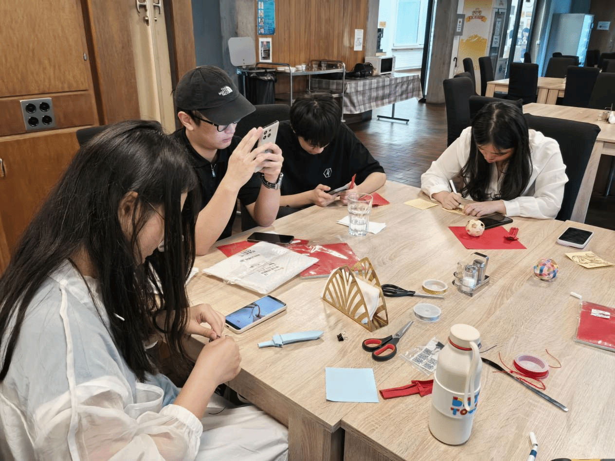 教室内,参与者们围成圈坐在桌前,彩纸在手中折叠翻飞,实践团以 “非遗龙泉宝剑” 为主题的折纸活动正在进行,队员们首先向参与者介绍:这把纸剑的原型,是有着2600多年历史的龙泉宝剑,它不仅是古代军事技艺的结晶,更象征着诚信高洁,体现了中华民族的尚武精神与工匠精神。为让参与者们更好动手实践,团队将复杂剑形简化为易操作的折纸版本。成员在步骤讲解过程中以当地风景作比“剑要折得挺直,才能像阿尔卑斯山一样‘巍峨持久’。”这一隐喻其实也与中瑞两国在历史长河中坚守自身特色、抵御外界挑战的精神相呼应;折纸过程中,团队成员分散在各桌,耐心示范,用英语指导大家用红白两色纸张折叠,红色是对“中国红”的呼应,白色能更好模拟剑身的寒光。活动现场气氛热烈,其乐融融。