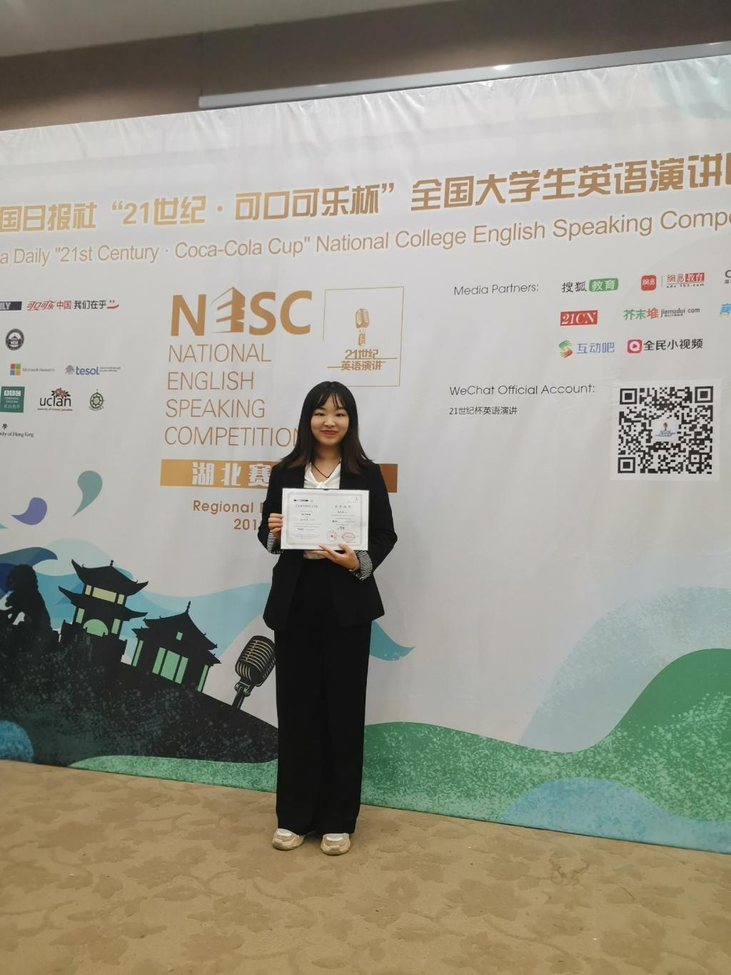 “21世纪杯”英语演讲比赛是目前国内最重要、档次最高的英语演讲比赛。经过网络选拔、电话口试,来自武汉大学、华中科技大学、华中师范大学等高校的30名选手参加了本次湖北赛区总决赛,决赛分为已备演讲、即席演讲、现场问答三个环节。已备演讲的主题是“No person is an island”(“没有人是一座孤岛”),旨在响应习近平总书记提出的“构建人类命运共同体”的号召,以促进当代大学生对于全球共同发展、共同进步的理性思考。马子恒在演讲则另辟蹊径,她从环境保护这一角度表达了自己的看法,她认为,每个人都是自然的一部分,日常生活中微不足道的环保行为也将会汇聚起强大的力量,让我们居住的星球变得更加绿色美丽。即兴演讲的考题是“大学生应该自主创业还是专心学习”,马子恒在演讲中表明了自己的态度,大学生应当专注于提升自我,夯实专业基础。在整场比赛中,马子恒表达流利,视角独特,重点突出,大方自然,充分展示了扎实的英语功底和灵活的应变能力,最终荣获湖北省赛区二等奖。