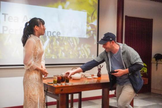 在对中国茶文化进行了初步了解后,由茶学研究生赵潇懿和茶学留学生Bernard分别进行了中国茶艺表演,他们的动作一致却又各具特色,赵潇懿的举止动静之间皆是古典之美,而Bernard的表演又颇具几分异域风味。吴嘉怡做了中英文双语讲解。