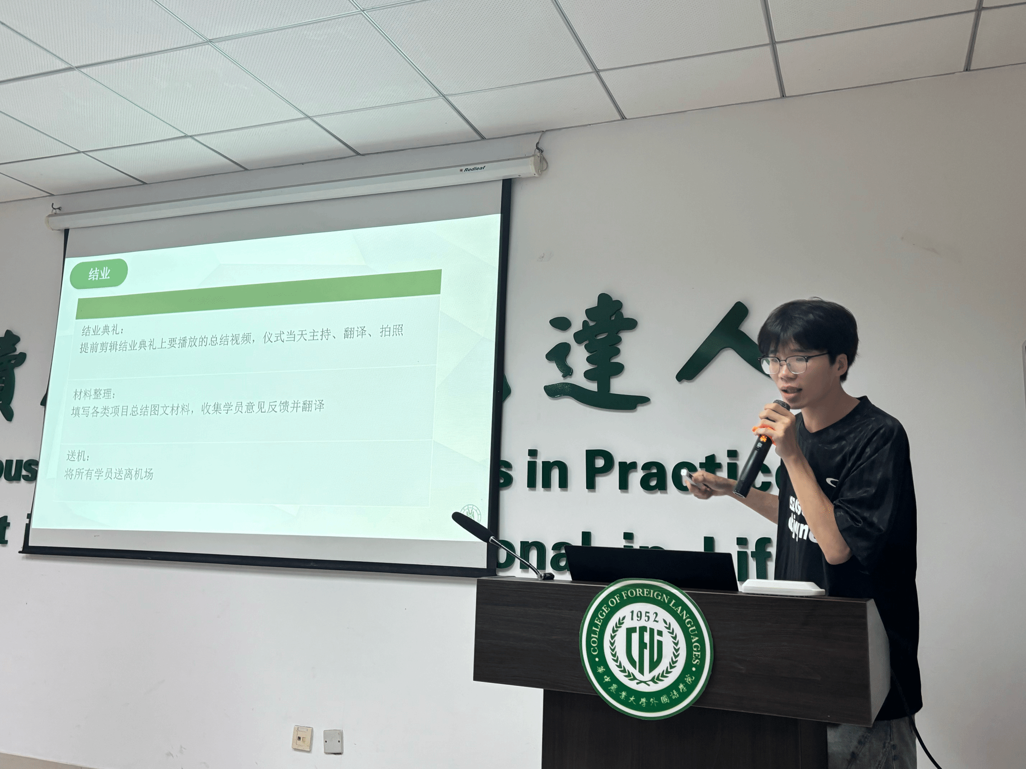 24级翻硕许承强以“涉农援外实习分享”为主题,结合自身的实战翻译经历,系统介绍了整个实习过程。首先,他从整体上介绍了实习背景和基本情况,让同学们对涉农援外培训项目有了清晰的认识。其次,他对项目本身进行了详细解读,包括主要任务目标、服务对象以及实施环节,帮助新生们了解此类项目在国家对外交流中的定位和意义。
