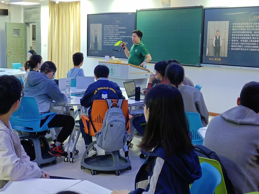 第三次课(3月30日5-8节)由优秀校友赵玉衡和他的合伙人讲授。赵老师创办了泉州尚美包袋有限公司,主要从事跨境贸易,给学生分享了他的创业历程和企业文化,他曾经有过数次的创业失败,这些经历不仅没有打倒他,反而让他在低谷中奋起,直至成功与壮大。“在哪里跌倒就在那里爬起”“不要轻言放弃”,这种创业韧性令学生十分钦佩。