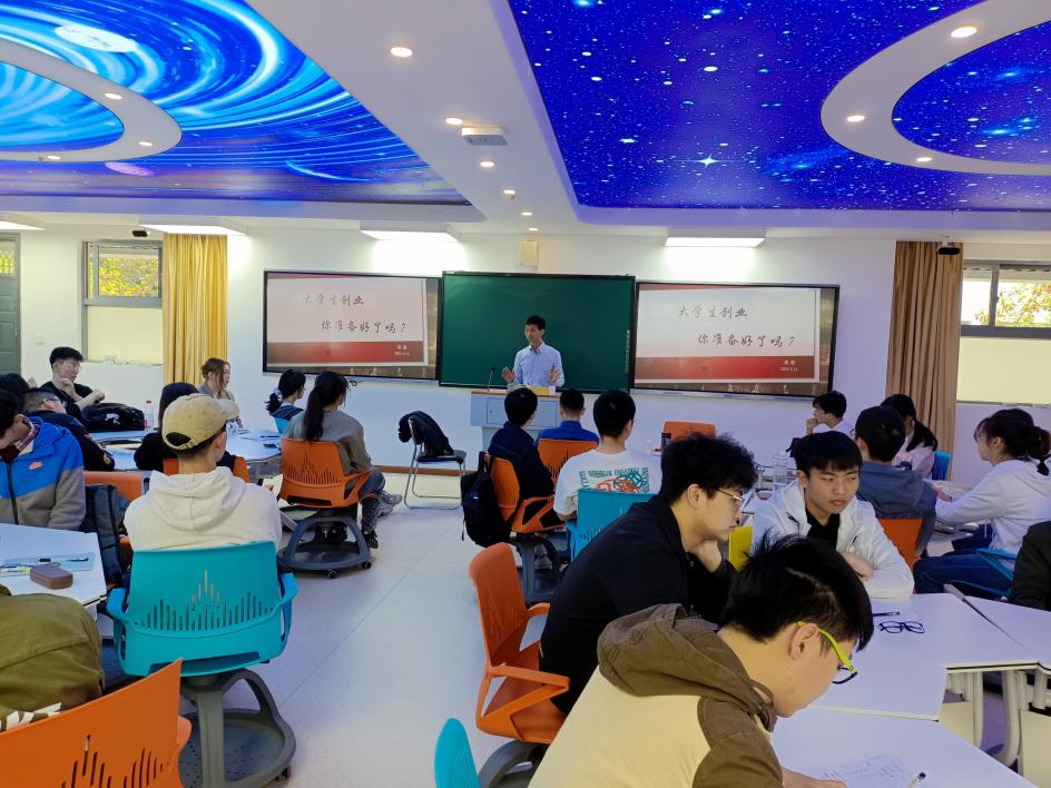 第五次课(4月13日5-8节)由优秀校友吴磊讲授,他创办的是教育行业。他结合自己实践经历以及读书阶段所获得的知识讲解了一些商业中科学模型的应用,同时给学生传达一条重要的理念:课本知识、模型只能帮助你在创业和商业实践中减少失败的风险,而不能提升成功的可能性。他还给学生分享了一个最珍贵的内容是有关团队与团队领导问题。他着重强调了第一家公司对于一个年轻人或者一个未来的创业者在团队协作与管理上有非常大的影响,因此一个公司的团队氛围一定应当被纳入选择第一份工作时候的考虑因素中,进一步加强学生对于目标公司团队环境的了解和认识。