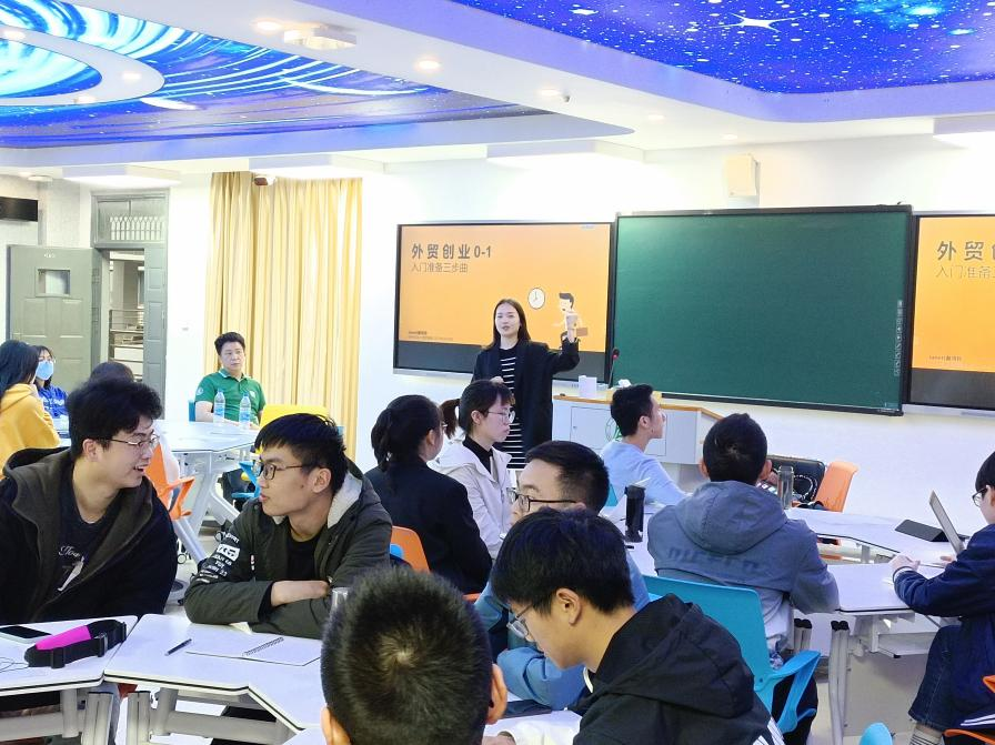 为让学生对创业有更深体验,赵老师的创业合伙人为同学们讲解了《外贸创业入门三部曲》,从招聘、选品渠道、平台选择、客户如何分析等详细进行讲解,可谓是倾囊相授,具有很强指导性。最后环节,老师组织学生进行了一场“创业团队”实战训练,让学生结合老师所讲内容进行“创业初期方案规划”,将学生分成8组,每个小组扮演一个创业团队,从创业项目、公司名称、企业文化、团队分工、主营产品等细节制定完整的商业策划书,并进行展示。老师对每组展示情况进行了点评,指出了不足,并给出了许多中肯的建议,令学生受益匪浅。