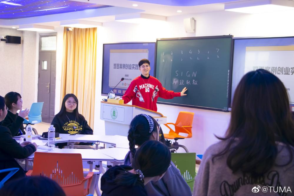 第一次课(3月16日5-6节)、第二次课(3月23日5-6节)由本校英语专业应届毕业生戚继昀讲授。他在学习期间成功创办了土马(武汉)网络科技有限公司,创立了自己的微信公众号TUMA。不仅讲授了自己作为一个英语专业大学生创办网络科技公司的经历和体会,提出创业初期必须具备的几大要素等。对于大家热议的“大学生是否应该创业”这个问题,他没有直接给出答案,而是出了一个辩题“家境普通,但是很有想法,该不该在大学期间选择创业?”启发同学们进行思考,并分组从正方和反方展开激烈辩论,然后根据辩论情况进行总结。通过这次辩论,学生们明白创业不仅可以是一些投资非常巨大的项目,也可以是一些投入很小的小本买卖,更重要的是创业要紧跟时代步伐,要抓住时代风潮,与时俱进。