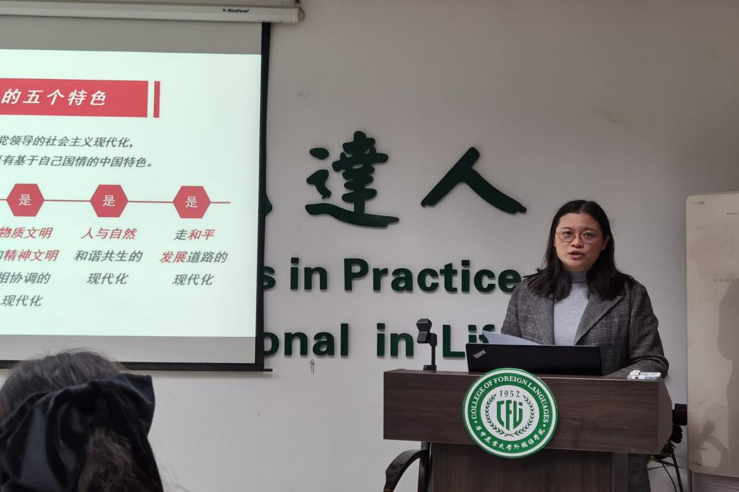 随后,袁谦老师领学了中国式现代化的重要论述内容,并从中国式现代化的科学内涵、中心任务、本质要求、战略安排、重大原则等五个方面进行专题阐释。党的二十大吹响了全面建设社会主义现代化国家和全面推进中华民族伟大复兴的时代号角,提出了一系列新思想、新观点、新要求。经过改革开放四十多年的发展,中国式现代化符合历史潮流,所取得的成就举世瞩目,反映人民呼声,发展前景广阔。结合自身教学实践,她勉励在场学生坚定四个自信,勇创新、定锚向,将语言学习与文化传播融汇贯通,自觉讲好中国故事,传递中国声音。