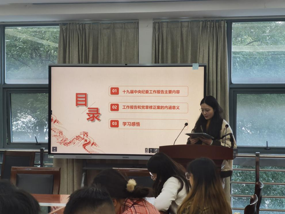 随后,商英本科生第一党支部第一和第四党小组代表薛飞、周淼晴分别对《中国共产党党徽党旗条例》以及十九届中央纪委工作报告与党章修正案进行领学分享,详细解读了中国共产党党徽党旗精神,并细致阐述了此次中央纪委工作报告和党章修正案的内涵意义。
