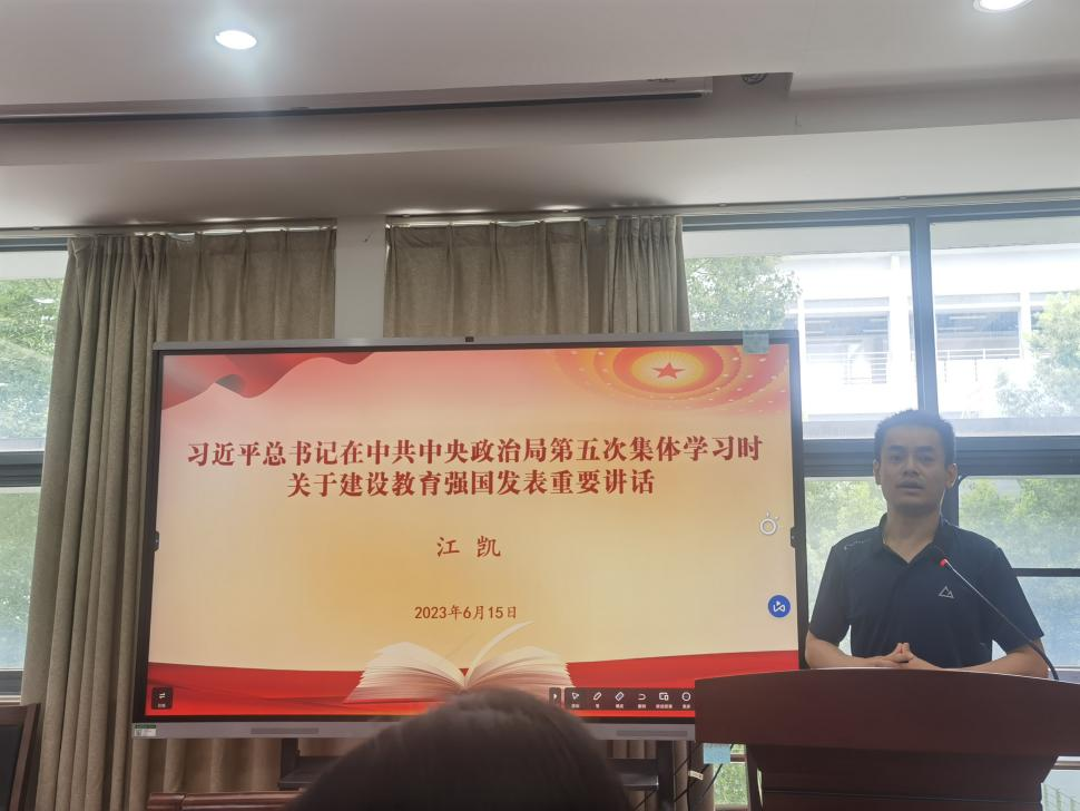 公外教工第二党支部江凯同志对习近平总书记在二十届中共中央政治局第五次集体学习中强调的教育强国理念进行了解读。他从建军25周年运动会时的“识字赛跑比赛”引入,绘声绘色地讲述了建国初期至今中国从扫盲运动、推动基础教育再到大力发展高等教育的辉煌成就。他指出,强国必先强师,夯实教育强国之基,需坚持把高质量发展作为教育的生命线,努力加强教师队伍建设。