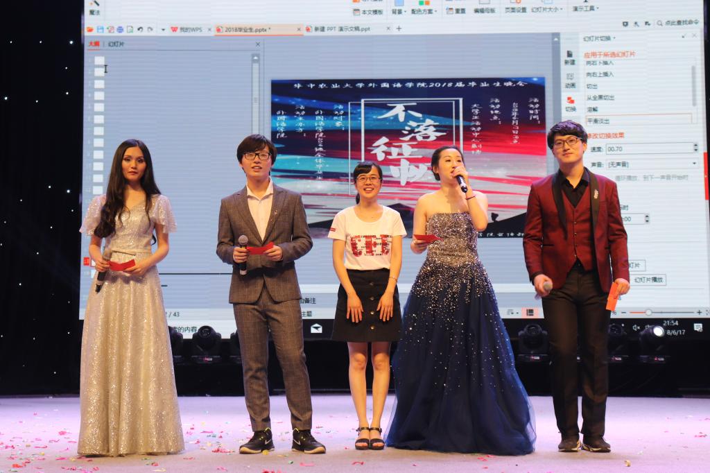 晚会开场前,剧场里洋溢着14级毕业生的笑声。今晚注定令他们难忘。开场舞结束后,晚会正式拉开帷幕。英语1403班为我们带来了精彩的歌曲串烧——光阴的故事。他们用歌声表达了对青春的赞美和留恋。弦歌不辍,薪火永存。这是英语1402班对母校的祝福。他们以舞台剧的形式展示了“华农宝藏”,英汉农务词典的前世今生。他们以幽默的台词和生动的表演赢得了观众的阵阵笑声。商英1401班的节目《Graduates 27》则将现场气氛推向高潮。男生们用自己的方式完美诠释了创造101中的经典舞蹈。