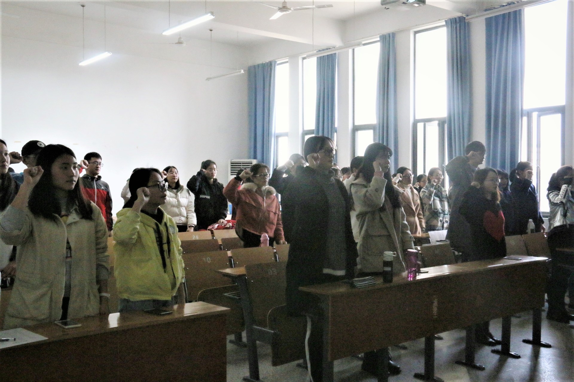 颁奖仪式后,在1706班冯小萌同学的带领下,理研会全体新会员起立并庄严宣誓:我自愿加入中国特色社会主义理论体系研究会,积极参加各项活动,为发扬中国特色社会主义理论作出贡献!
