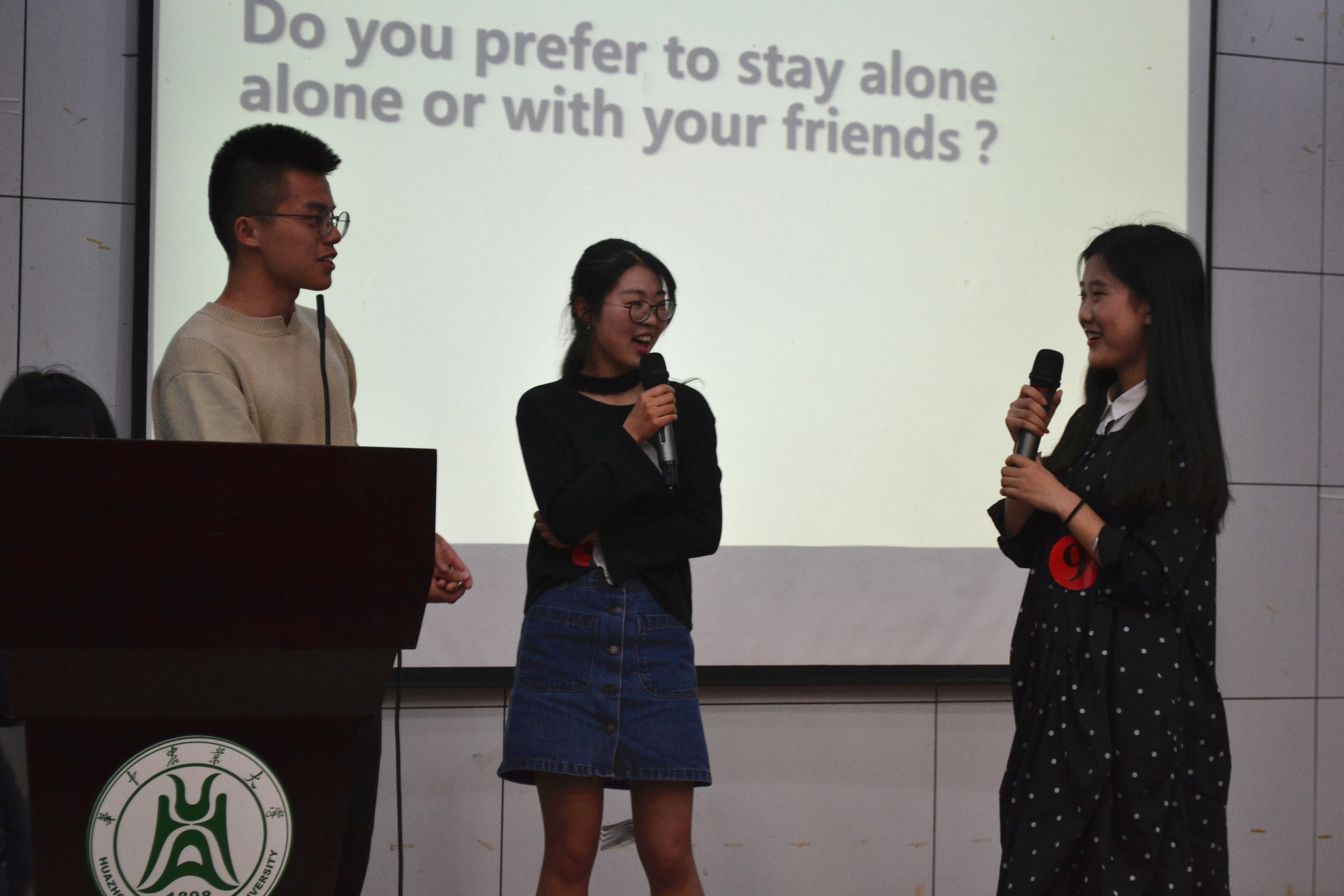 在第一轮比赛中,五组选手分别以“Which one is more important, family or friends?”,“Why do many foreign countries develop faster than China?”和“Talk about the stage of your life that you enjoyed most?”为话题展开了即兴对话。虽是“即兴”环节,但选手们在台上毫不怯场,你一言我一语,泰然自若地进行了精彩的对话,引发了台下阵阵掌声。在第二轮比赛中,九位选手更是各展其姿,使尽解数,给观众们带来了一场精彩的视听盛宴。