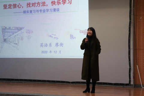 本次年级大会还邀请到廖衡老师为同学们做以“坚定信心 找对方法 快乐学习”为主题的期末复习与专业学习漫谈。廖衡老师首先引用王国维先生在《人间词话》中对治学三境界的阐释,“昨夜西风凋碧树,独上高楼,望尽天涯路”,鼓励同学们确立目标,定准方向,坚定信心,并持之以恒地为之奋斗。此外,她提到学习需要同学们“找对方法”,大二年级学生正在经历中级学习者向高级学习者转变的过程,学习目标发生很大的变化,需要更加注重英语语言技能培养与专业知识的并重融合。语言技能指英语专业基本的听、说、读、写、语法、词汇、译技能。她还用“林木”理论说明英语学习的综合性,英语学习不仅仅需要学习语言,还要了解更多关于国家文化、文学、商务、外贸等等知识,“先俯瞰森林,再凝视树木”。2020年中国在抗疫中发挥了很大作用,所以英文专业的学生应该培养中国文化的全球视野,未来的趋势也是中国文化走向全球化的过程,我们更加应该讲好中文故事。对于学习和复习备考的方法,她认为每个人应找对适合自己的方式,学会整理笔记:善于利用图书馆或网络资源查阅资料,积极求问老师,查缺补漏,建构学科脉络,萃取课程精华。同时,同学们应该都学会“快乐学习”,保持良好的心态,健康的体魄,掌握学习方法才能提高学习效率,在轻松的心态中,享受阅读文学经典的乐趣,才能汲取更多的知识。