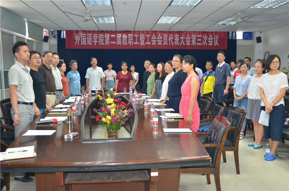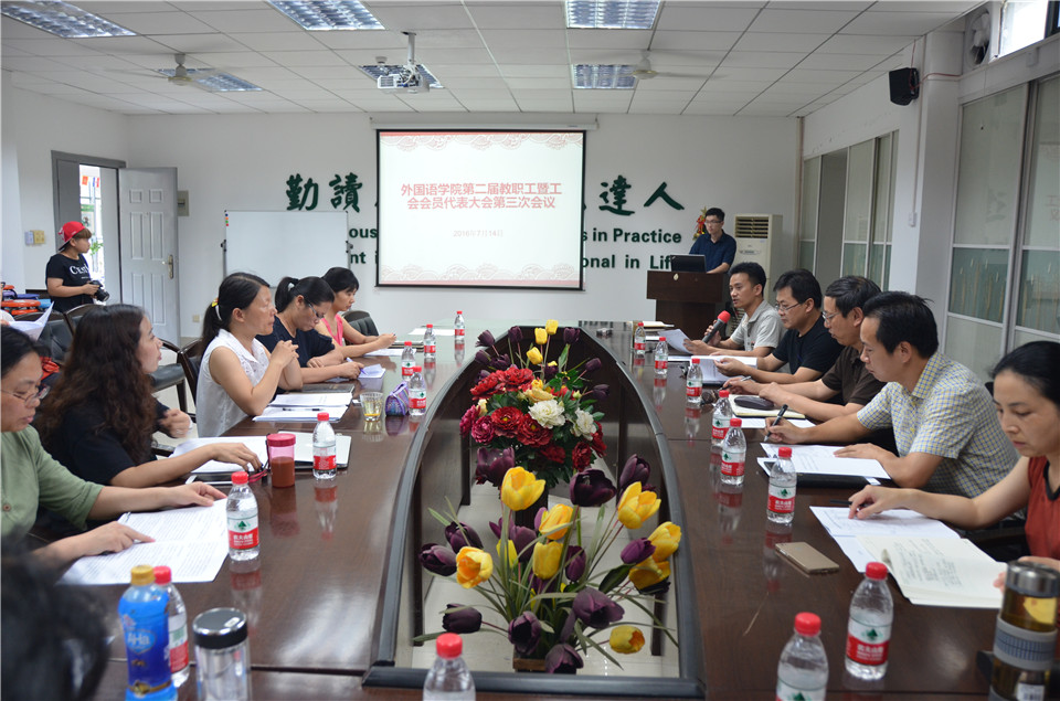 7月14日下午,pg娱乐电子游戏官网入口召开第二届教职工暨工会会员代表大会第三次会议,审议学院“十三五”事业发展规划,听取2015-2016年学院工会工作报告。学院教职工暨工会会员代表、特邀代表等参加了会议。校党委常委、副校长李崇光、校工会负责人余顺华同志等出席会议。