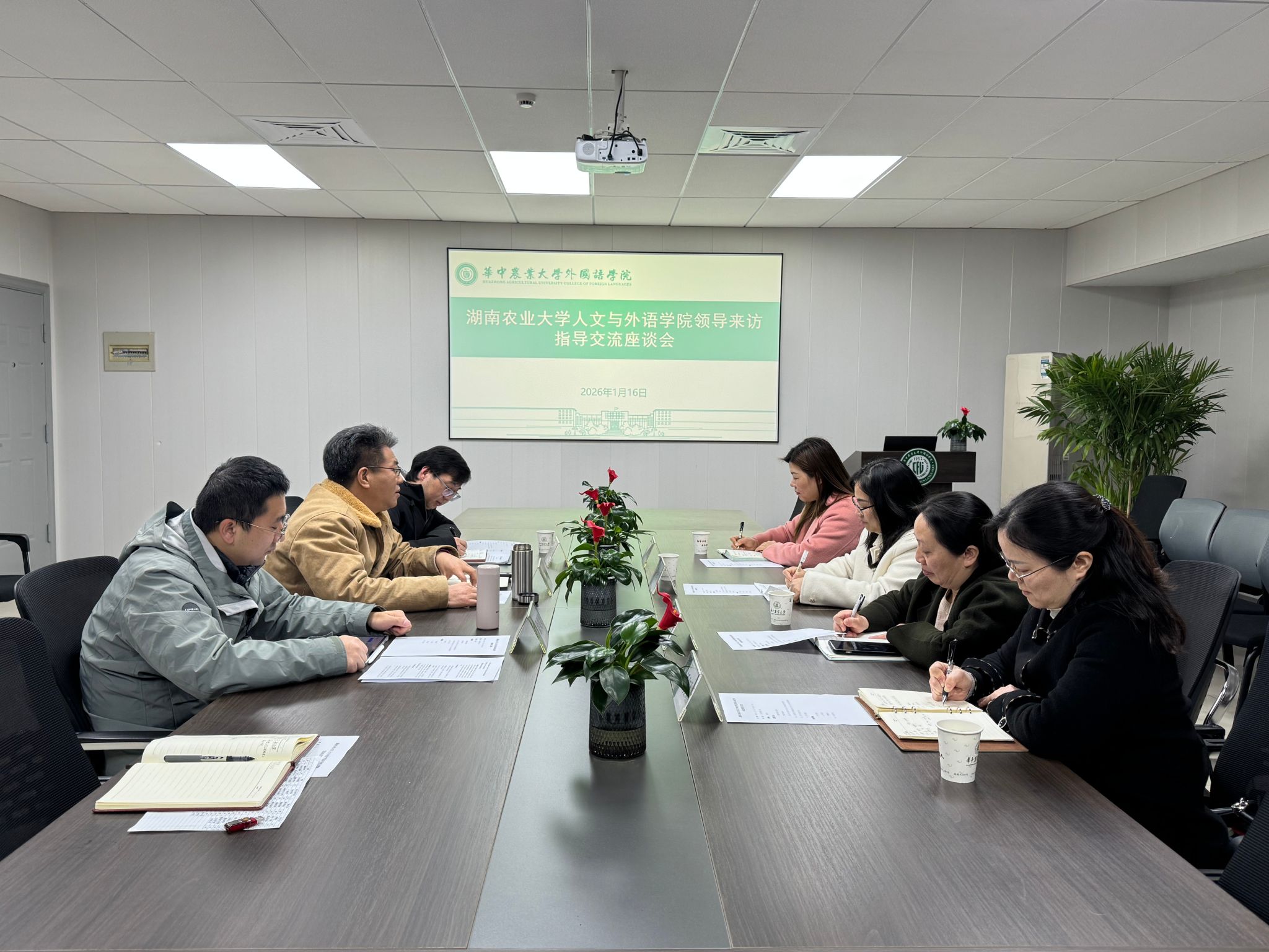 2026年1月16日上午,湖南农业大学人文与外语学院院长季红琴一行来pg娱乐官网调研交流。座谈会在人文楼附楼A102会议室举行,由党委书记冯国林主持,副院长耿云冬、英语系主任徐贝贝等参加交流。