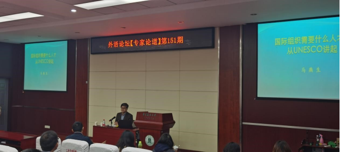20211021日上午,原中国常驻联合国教科文组织副代表、北京外国语大学副校长、中国驻法国使馆公使衔教育参赞马燕生教授应邀做客第151期外语论坛·专家论道,在人文楼M115室为pg娱乐官网师生做了题为“国际组织需要什么人才:从联合国教科文组织讲起”的专题讲座。讲座由pg娱乐电子游戏官网入口党委书记胡守强主持。
