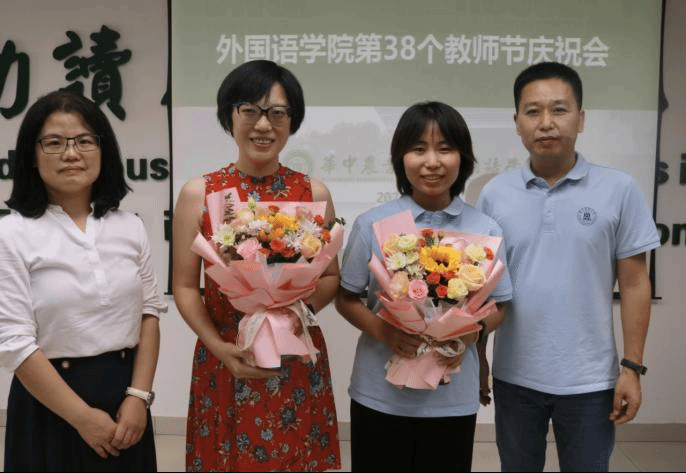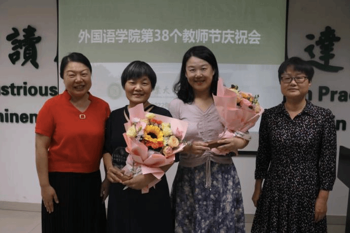 党委副书记许刚、副院长王菲为新聘教师李昱、满秭岐献花,向加入外院大家庭的两位老师表示热烈欢迎。李昱表示,加入外院大家庭倍感荣幸,院领导的关心和支持给予她信心,在未来会以积极的姿态为学院作出贡献。满秭岐细数了自己与学院之间的故事,从学生转变为教师,她在外院的见证下不断成长,如今作为辅导员的她将继续引导学生,做“兼蓄中外,善思笃行”院训的忠实践行者。