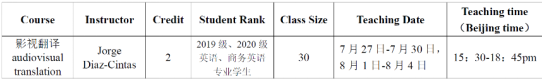 视听翻译理论与实践的发展,离不开视听翻译人才的培养。在此背景下,pg娱乐电子游戏官网入口开设了暑期全英文课程《视听翻译》(Audiovisual Translation),本课程通过Zoom平台以线上教学模式开展,授课时间为2022年7月27日-7月30日、8月1日-8月4日,授课对象主要为2019级、2020级英语和商务英语专业本科生。
