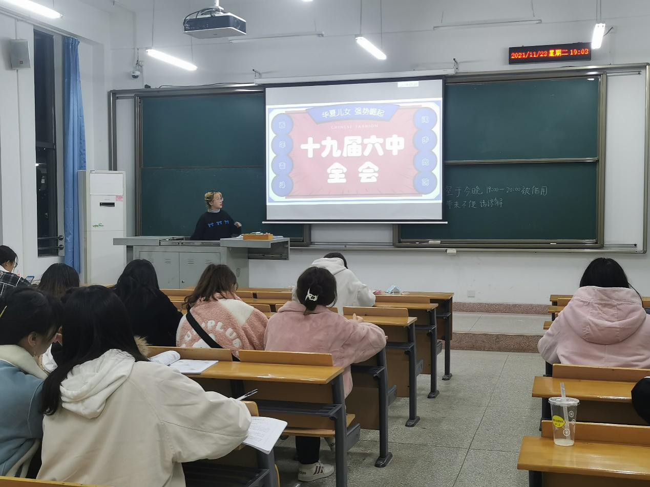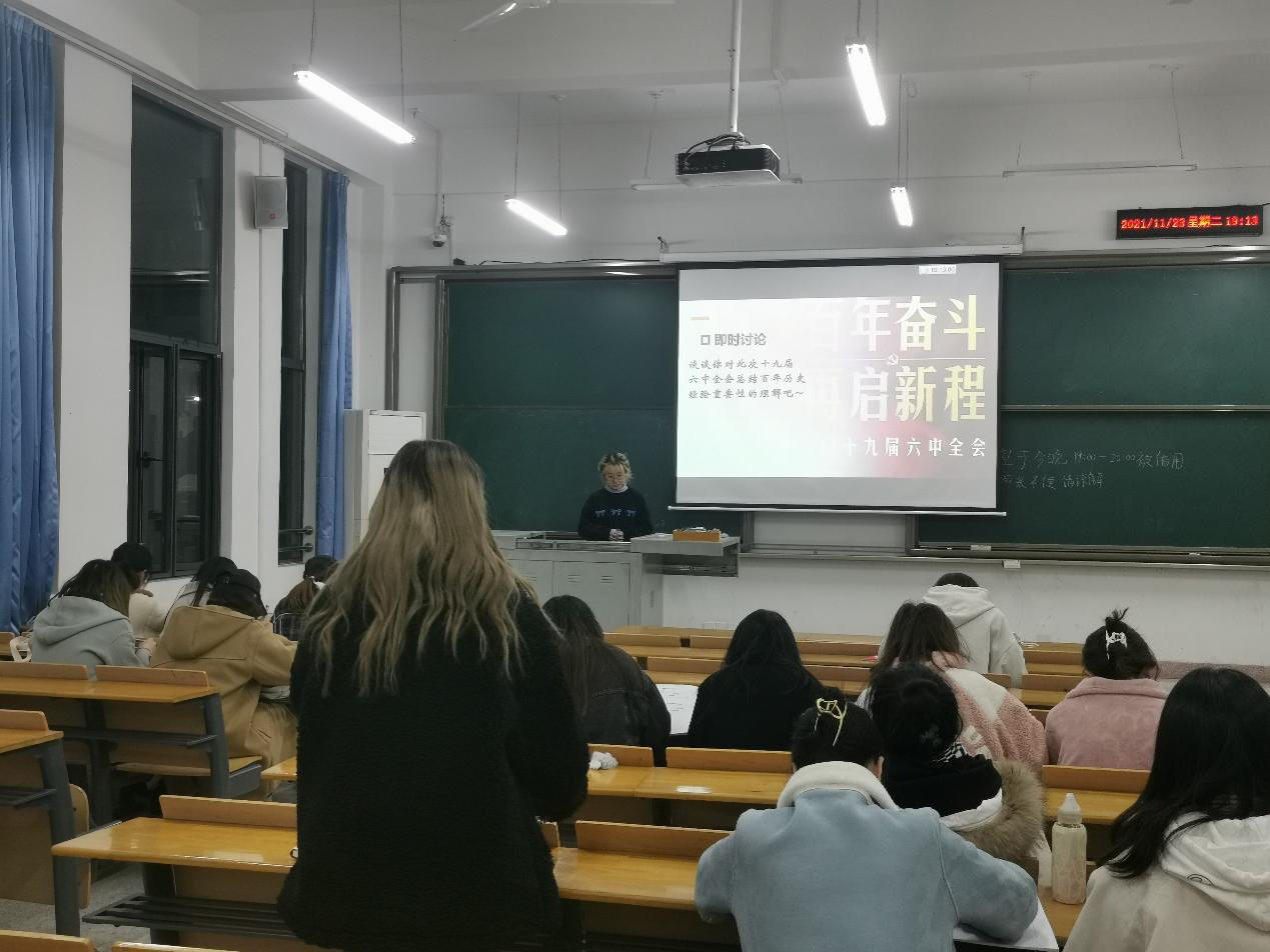11月23日晚上19时,pg娱乐电子游戏官网入口商务英语本科生第二党支部于四教C102开展了十九届六中全会专题党日活动。本次会议由支部副书记李敏勤主持。会议以“百年奋斗,阔步向前”为主题,分为介绍十九届六中全会基本常识、会议关键词翻译和宣读入党誓词三个环节。