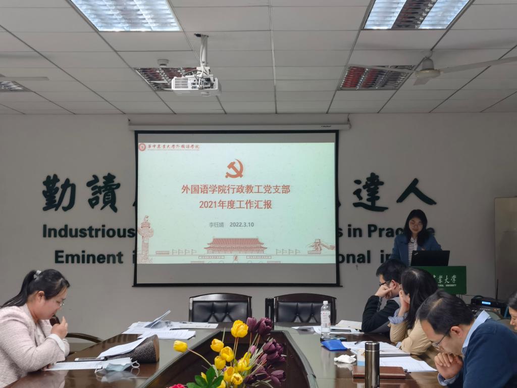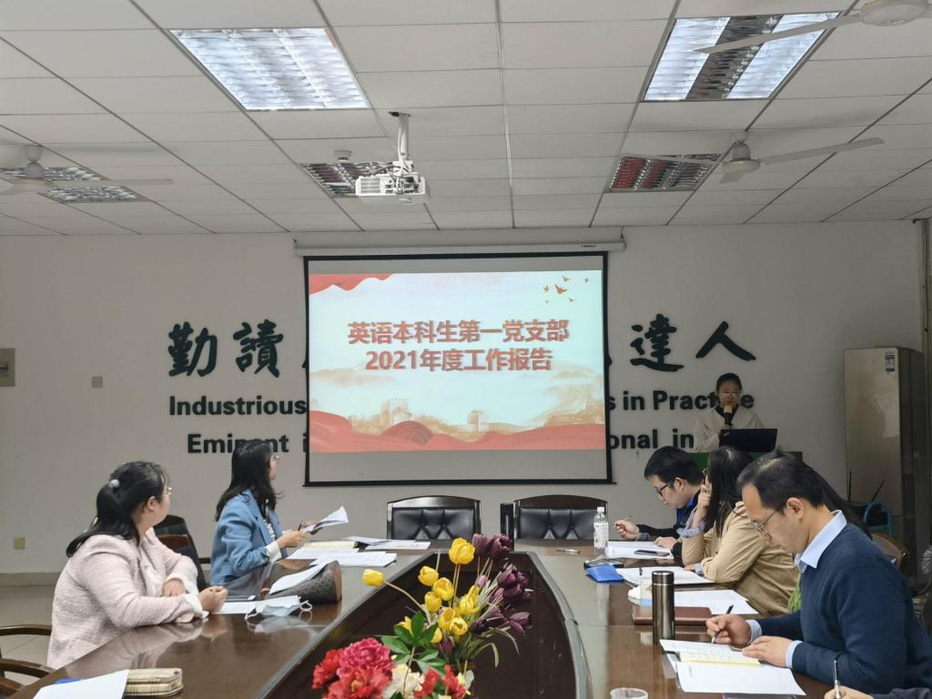 英语与商务英语系教工党支部书记袁谦介绍了支部成员围绕强化思政建设一个主题开展的集体理论学习、翻译十九届六中全会报告、下沉社区志愿服务等工作,并进行总结剖析,提出在丰富学习模式、加强党员教师管理等方面进一步完善。
