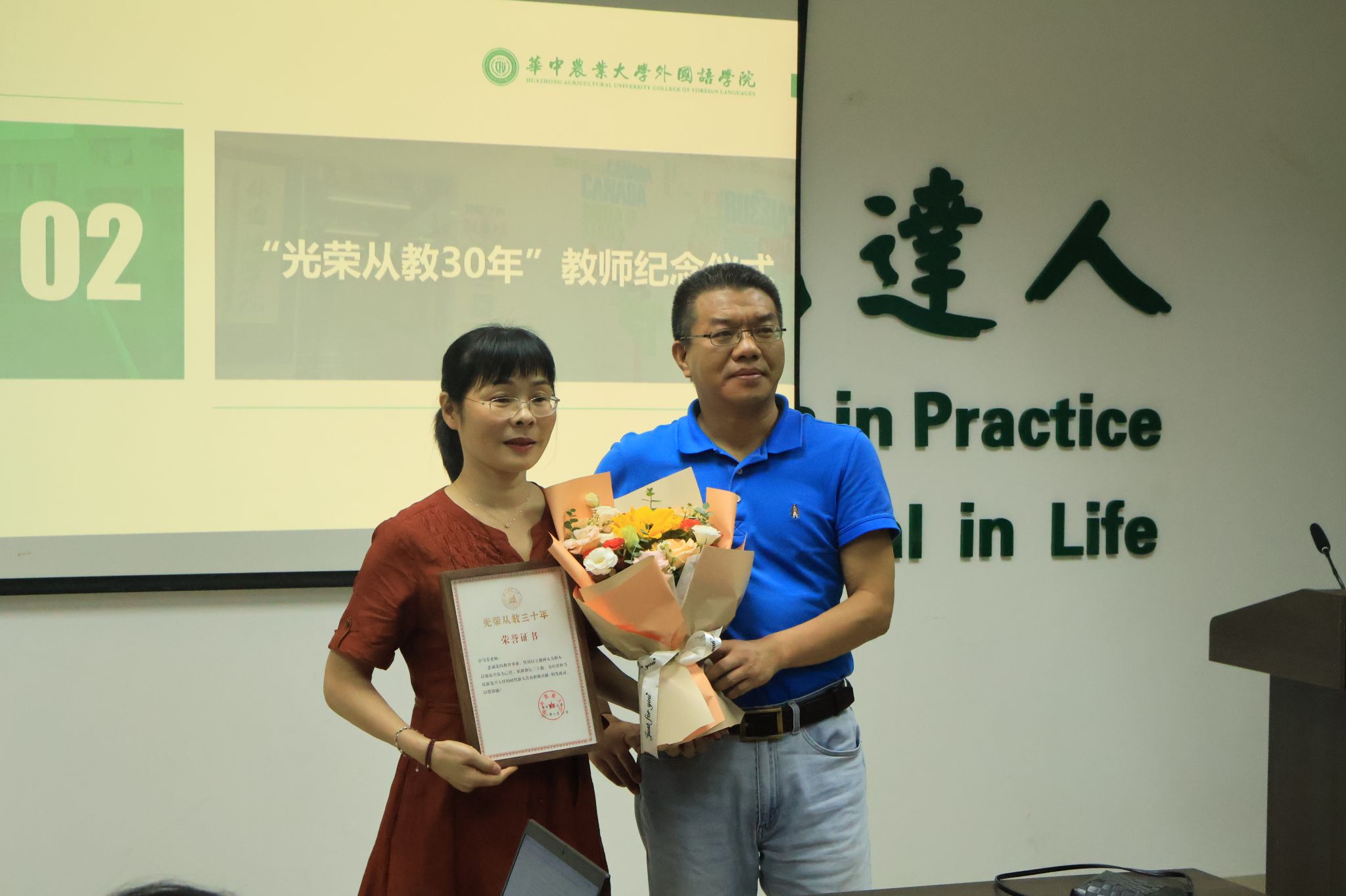 光荣从教30年教师纪念仪式上,冯国林为许雪芬老师颁发纪念证书并献花,向她三十年来始终坚守教学一线、潜心育人致以崇高敬意。全体教职工一同观看了许雪芬老师“讲述我的育人故事”短视频《牛铃与光》,片中师生之间的温情片段感人至深。许雪芬在发言中回顾从教以来的珍贵点滴,衷心感谢学院领导与同事长期以来的支持与鼓励,并表示将继续坚守教育初心,为一流人才培养贡献绵薄之力
