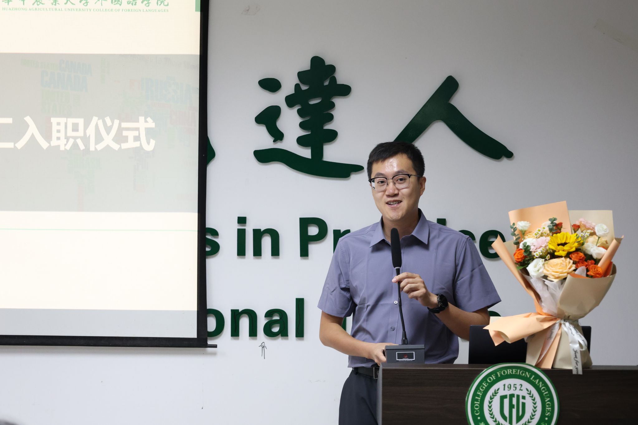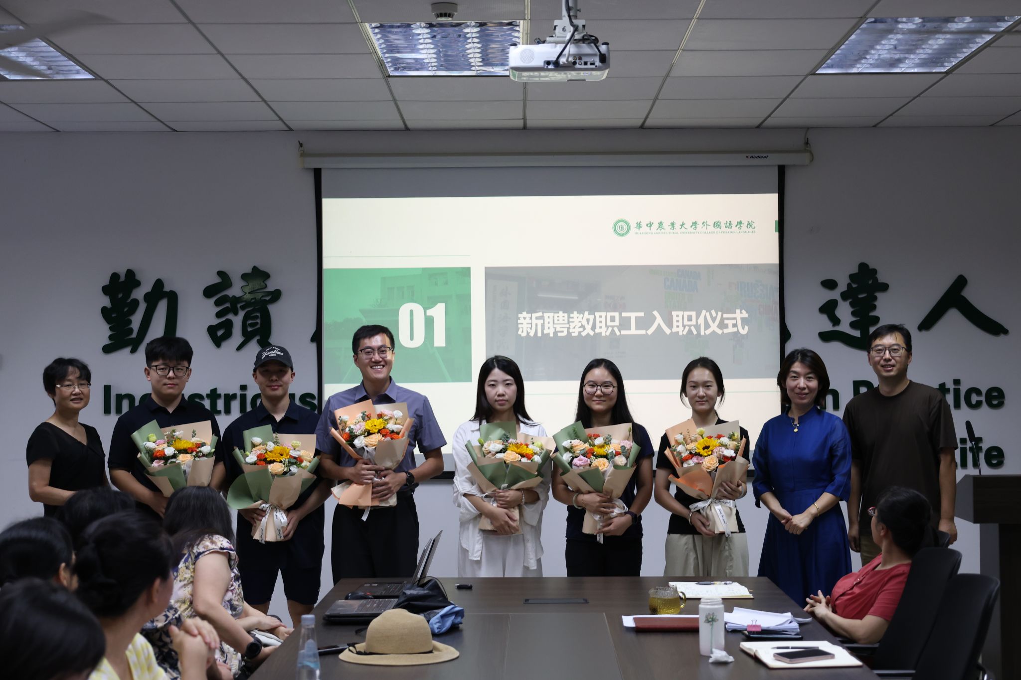 党委副书记任丹、副院长秦发兰、副院长耿云冬向周尧、蒋建、张松、宗梦竹、贺秋燕、韩兆雪等六位新教职工献花并致以热烈欢迎。新教师代表周尧作表态发言,表示将以“四有”好老师的标准严格要求自己,牢记为党育人、为国育才的初心使命,全力以赴为学校与学院发展贡献自己的力量。