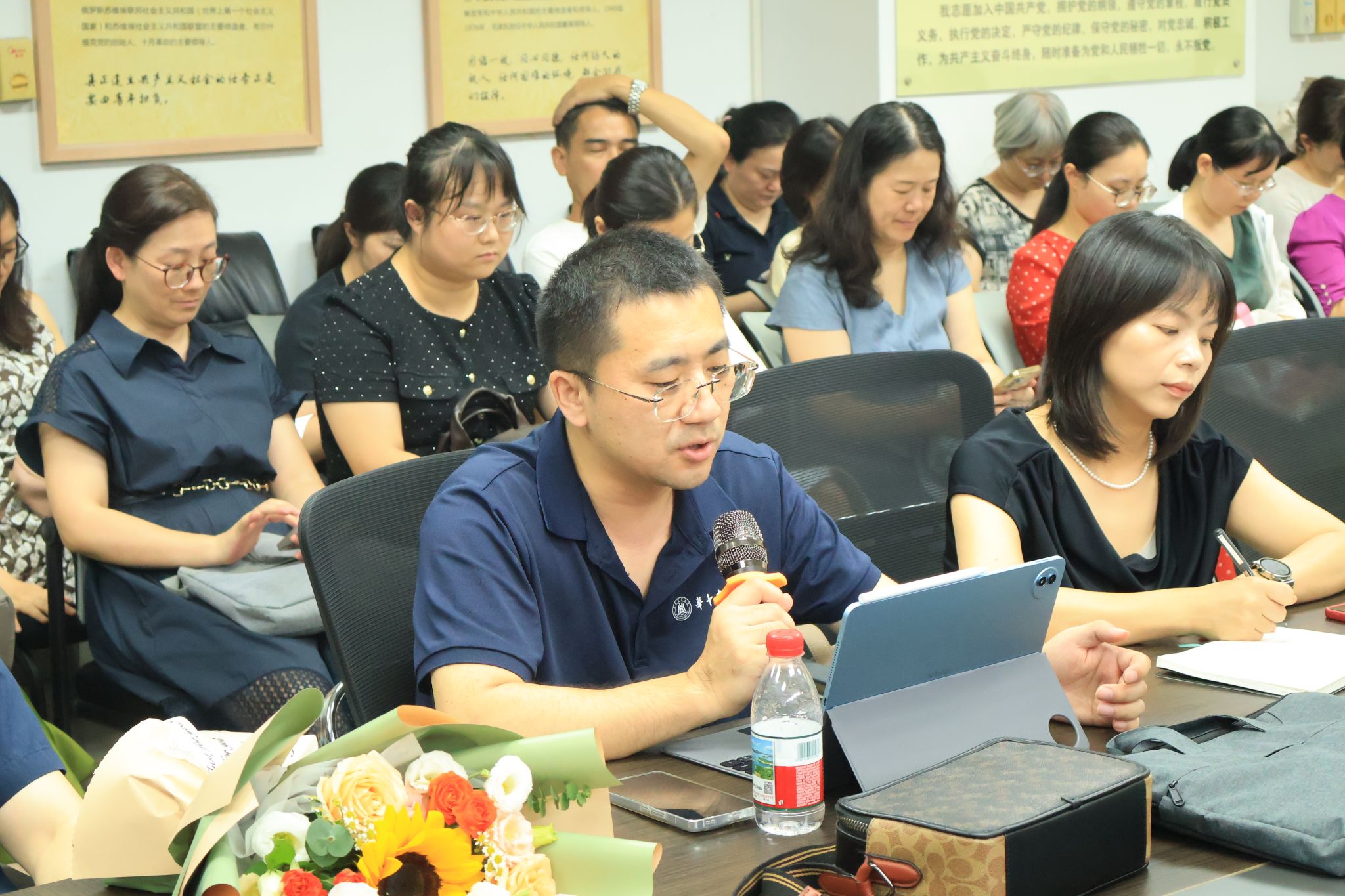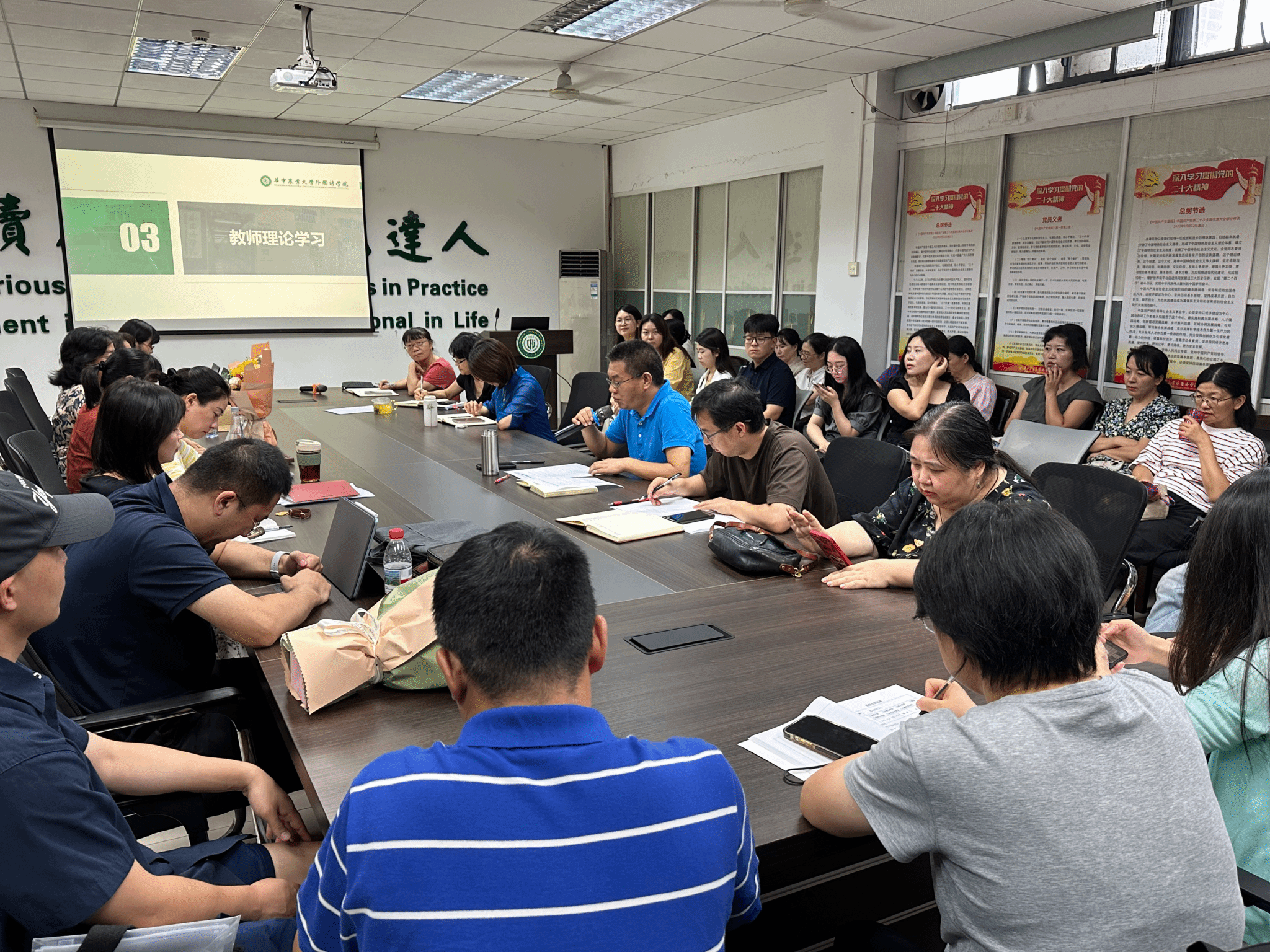 教师理论学习环节,冯国林领学《习近平谈治国理政》第五卷,重点解读了其中蕴含的主要观点、科学方法和思想精髓,强调要将“四个意识”“四个自信”“两个确立”“两个维护”融入教育教学和科研全过程,并倡议全体教师结合学校本科教育教学评估与“十五五”规划工作,科学制定个人五年发展规划。许雪芬围绕习近平总书记关于教育强国建设及教师队伍建设的重要论述,从战略目标、核心能力与实践路径三个方面作了系统阐释,号召大家践行“四有”好老师标准。徐贝贝基于习近平总书记在纪念中国人民抗日战争暨世界反法西斯战争胜利80周年大会上的重要讲话,从历史教育、民族精神传承和国家安全角度,探讨了外语教学在树立正确历史观和增强国防意识方面的责任与路径。