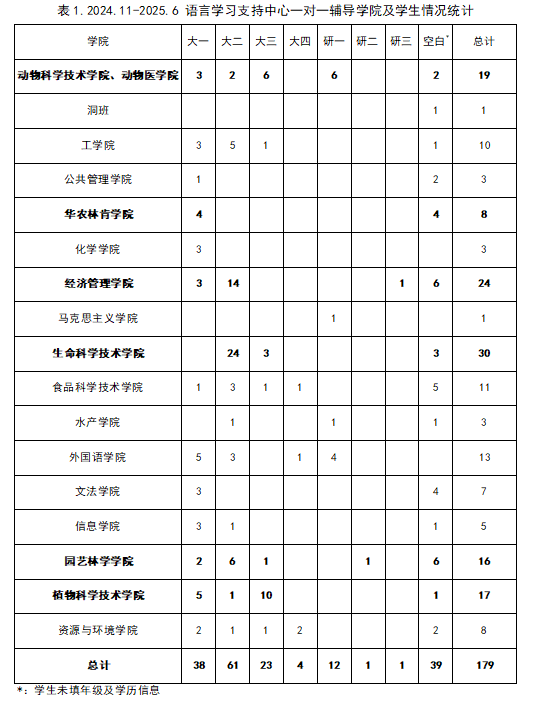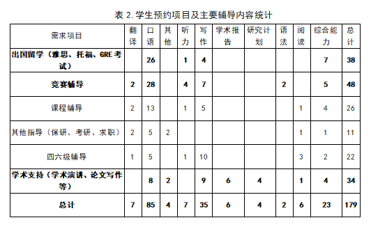 中心充分考虑学生的专业背景与个人发展目标,制定针对性的辅导计划,以确保每位同学在合适的时间获得匹配的教师指导。除了“一对一”深度辅导,中心还推出了点面结合的系列专题讲座,构建了立体化的支持体系。自2024-2025学年度以来,语言支持中心已为全校所有学院的学生提供了个性化一对一辅导,累计179人次,覆盖本科、硕士及博士各学段(表1),学生需求多元且个性化,共性需求聚焦于高阶能力辅导(表2)。本学年围绕学生需求,精心打造主题讲座,内容涵盖雅思备考全攻略、学术论文写作、留学生活分享及中西文化赏析,参与学生超过600人次。语言支持中心点面结合式的学习支持活动,充分体现了公共外语教育在为学生成长服务、为“四新”和“双一流”建设服务。