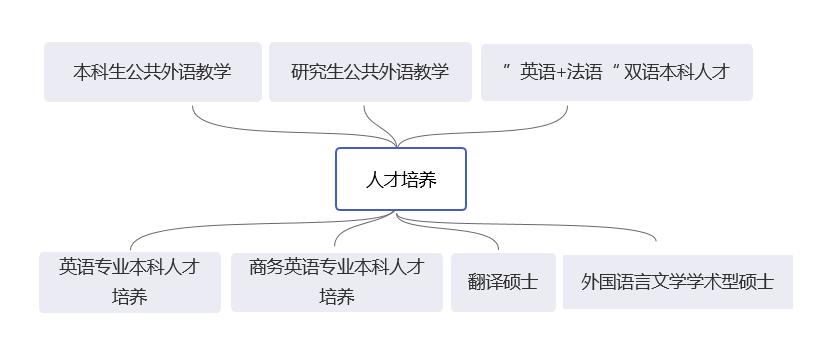 育人理念。学院坚持“以本为本、学生中心、兼蓄中外、善思笃行”的育人理念。公共外语教学秉承为学校“双一流”建设服务,满足学生多样化外语学习需要,培养学生国际胜任力、跨文化交际能力、语言综合运用能力、思辨能力和自主学习能力,主动改革,以贡献求发展,以服务求支持。英语类专业注重与学校优势与特色学科结合。培养语言基础实、文化品位高、文学素养深、学校特色明的高素质外语专业人才。研究生人才培养紧跟学科前沿与社会发展需要,以研究中心为依托,注重理论与实践并重,培养外语高端翻译人才、外国语言与文学领域高层次人才。